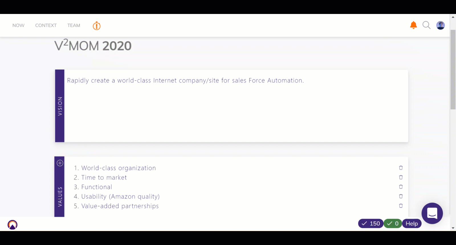 The V2MOM framework focuses execution and keeps teams aligned and agile. It was created by SalesForce.com founder Marc Benioff to drive SalesForce's growth from day 1. It's a perfect fit for many organizations.